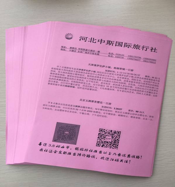 春季正是花開柳綠、服裝換季的季節(jié),旅行社全體成員談討研究,在三月份每周推出特價旅游團,北京玉淵潭公園賞櫻花一日游,天津佛羅倫薩小鎮(zhèn)、楊柳青古鎮(zhèn)休息購物一日游,為黃驊、中捷百姓提供一個踏青賞花、游、購、娛的服務(wù)平臺。