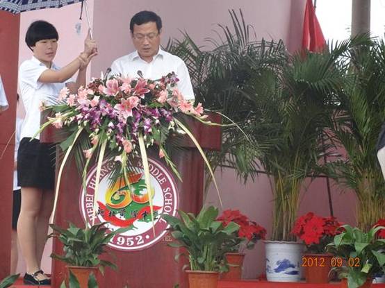 2012年9月2日上午10點,秋雨淅瀝,彩帶飄飄。黃驊中學(xué)在眾人翹盼中,迎來了她60歲的生日慶典,來自社會各界的校友齊聚一堂。慶典會上,集團公司總經(jīng)理于國臣代表集團公司董事長王振華,以及捐資助教的企業(yè)界同仁發(fā)言。發(fā)言中,于總既表達(dá)了中捷石化對黃驊中學(xué)的深切關(guān)注和支持,又表達(dá)了對黃驊中學(xué)60年華誕的祝福,以及對歷屆教師春風(fēng)化雨的敬意。