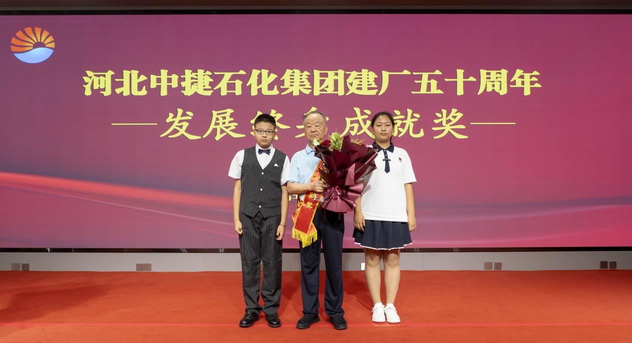 隨后,全體與會人員共同觀看宣傳片《王者之光振業(yè)華彩》,領(lǐng)略中捷石化集團董事長王振華先生作為開拓者與掌舵者的戰(zhàn)略遠見與輝煌成就。為致敬其數(shù)十年傾注心血智慧、引領(lǐng)集團劈波斬浪的杰出貢獻,大會特授予王振華先生“中捷石化發(fā)展終身成就獎”,兩名石化子弟代表登臺獻上崇高敬意,生動詮釋了中捷石化精神血脈的代代相承。