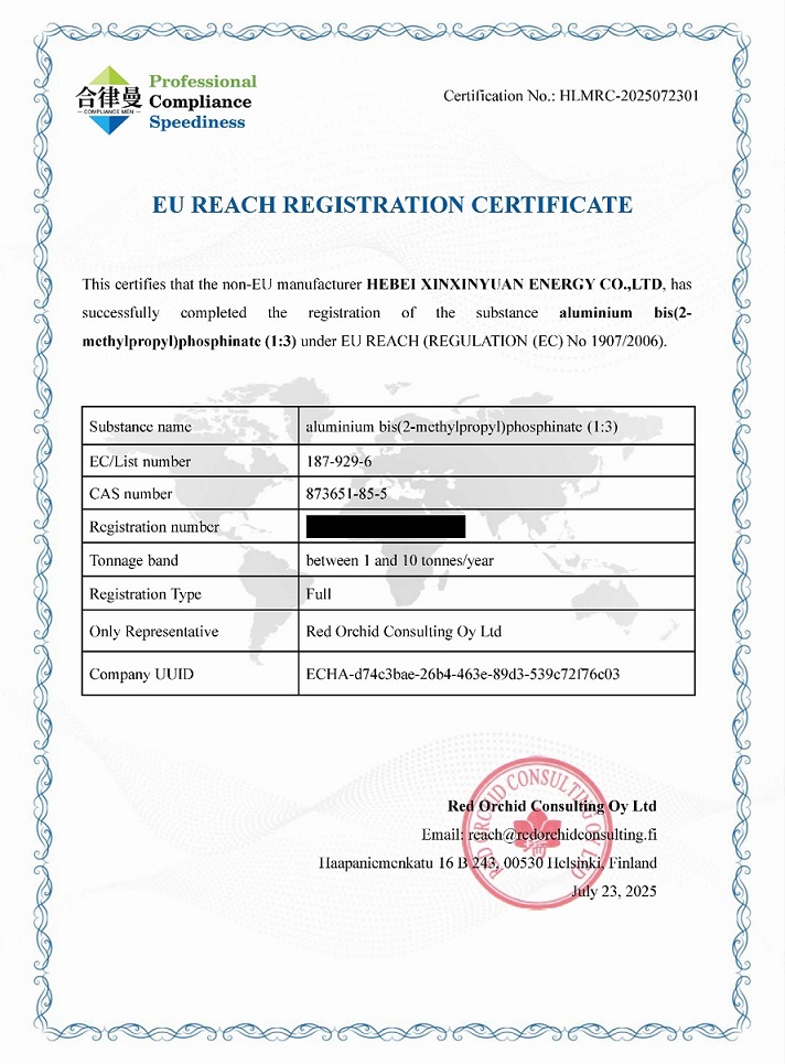新欣園公司訊  7月23日,河北新欣園能源股份有限公司自主研發(fā)的二異丁基次磷酸鋁產(chǎn)品成功完成歐盟REACH領(lǐng)頭注冊,成為該產(chǎn)品全球首個(gè)獲得歐盟官方認(rèn)可且拿到歐盟市場“通行證”的廠家,正式確立新欣園公司對于該產(chǎn)品在歐洲市場乃至全球的主導(dǎo)地位。