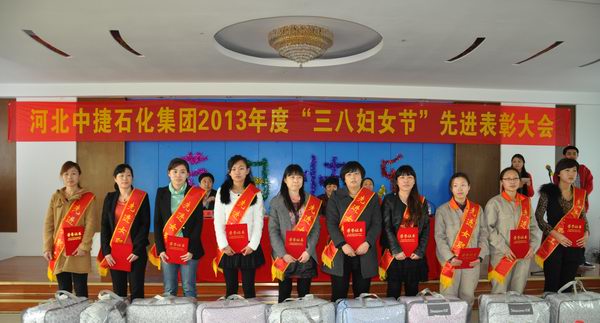 為了紀(jì)念“三八”國際勞動婦女節(jié),表彰在過去一年中表現(xiàn)突出的先進女工,中捷石化集團組織各所屬公司于2013年3月8日在華潤瀝青會議室舉辦2013年度“三八婦女節(jié)”先進表彰大會,出席本次會議的有中捷產(chǎn)業(yè)園區(qū)工會主席姜淑芹、中捷產(chǎn)業(yè)園區(qū)計生局局長楊小、中捷產(chǎn)業(yè)園區(qū)工會財務(wù)部部長朱瑞玲、集團常務(wù)副總經(jīng)理劉國新、集團副總經(jīng)理張鵬、集團總工程師耿萍。