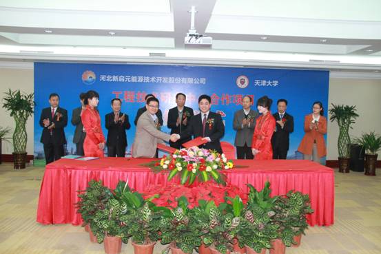 儀式上,河北新啟元能源技術(shù)開發(fā)股份有限公司總經(jīng)理喬樹華與天津大學(xué)科技處處長(zhǎng)楊明海代表雙方簽定了工程技術(shù)研究中心項(xiàng)目合作協(xié)議。