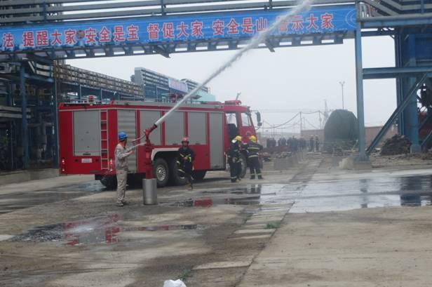 演練選在甲醇裝置廣場處進行。在模擬事故現場,參加人員分成多個應急小組,人員救援組進行人員救助,事故搶險組進行滅火,環(huán)境監(jiān)測組進行環(huán)境監(jiān)測,應急疏散組進行人員撤離并指揮消防車進入事故現場,各個環(huán)節(jié)緊張有序的進行。滅火完畢后指揮人員發(fā)布命令,宣布結束應急狀態(tài)。