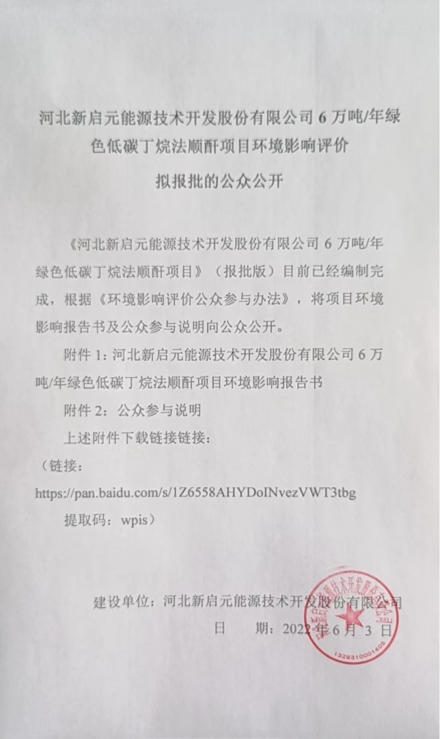 河北新啟元能源技術(shù)開發(fā)股份有限公司6萬噸/年綠色低碳丁烷法順酐項目環(huán)境影響評價擬報批的公眾公開